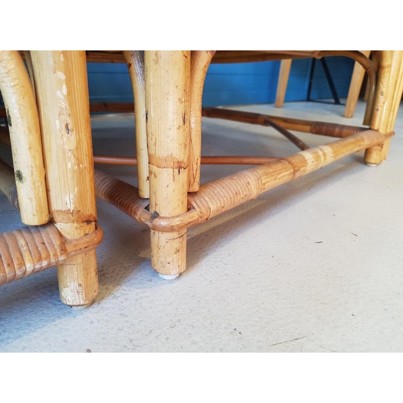 Superbe canapé en rotin vintage circa années 60, composé de 3 modules. Bel état général du rotin, pas de brin cassé.L'assise est confortable. Les houses en velours (trés tendance) d'origine, ne sont pas en parfait état. Un trou sur 'assise et 2 taches. Il faudra soit les réhousser , soit y jeter un plaid. Il est aisé de le faire tenir (cf photo).