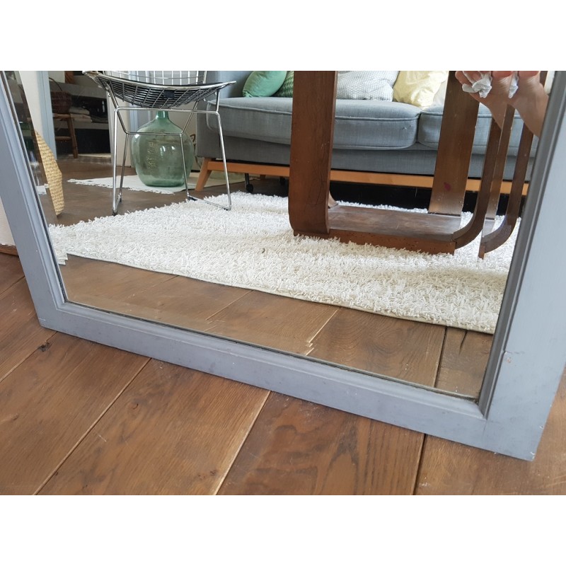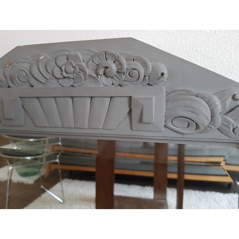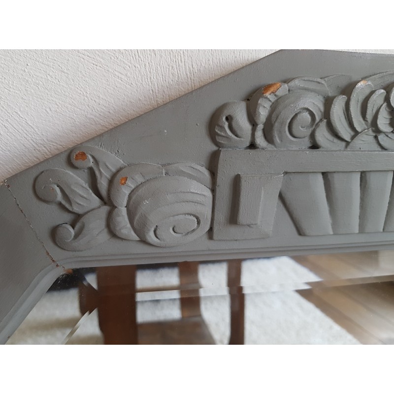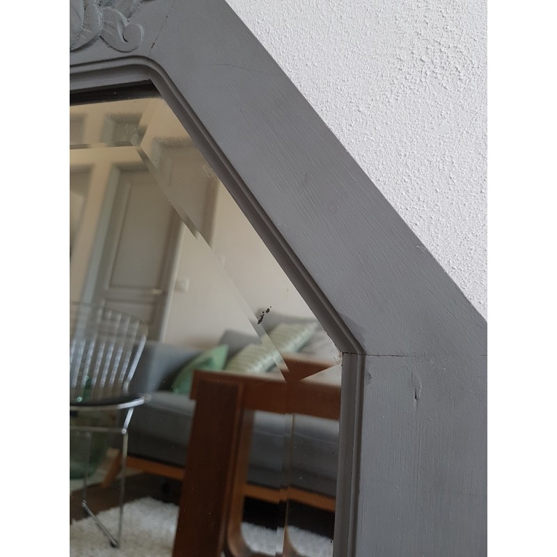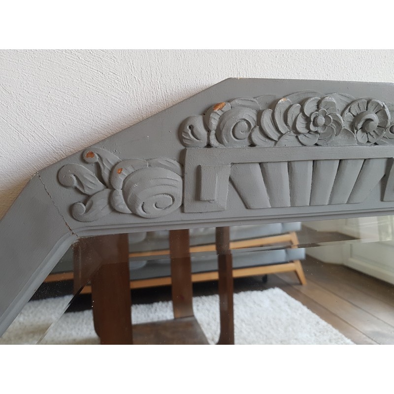 Superbe miroir art déco en bois. Peinture grise "used" (cf photos). Quelques (trés) discretes traces du temps (photos). Verre biseauté.