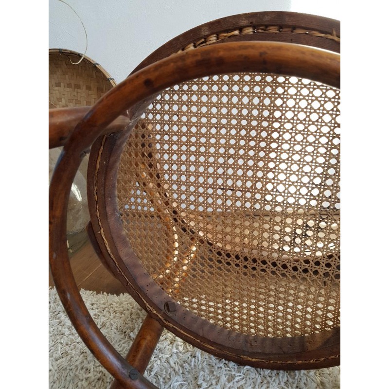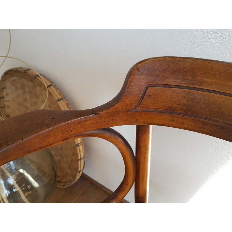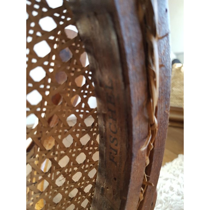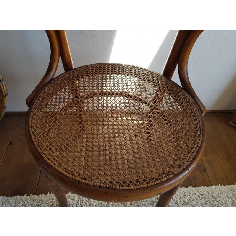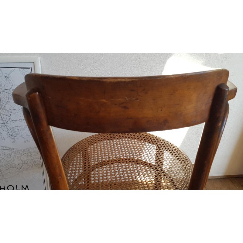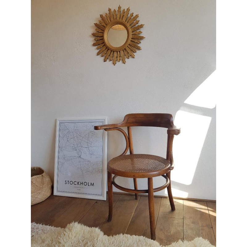 Fauteuil Fischel canné vintage. Superbe patine, bon état du cannage, un léger jeu à signaler. Beau travail de bois courbé pour ce concurrent si prisé de Thonet.