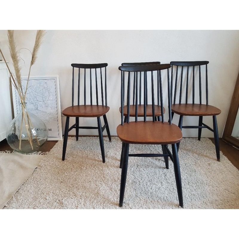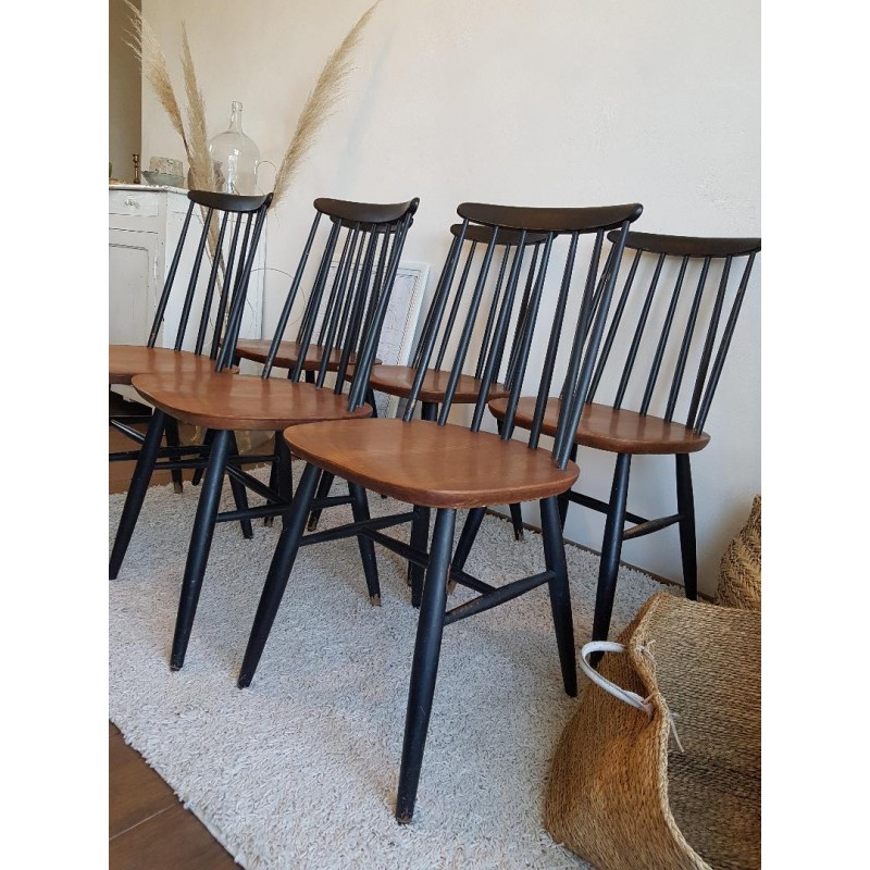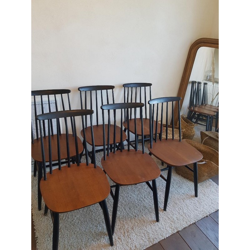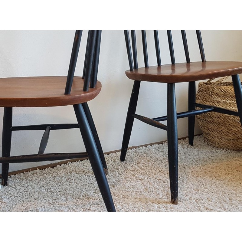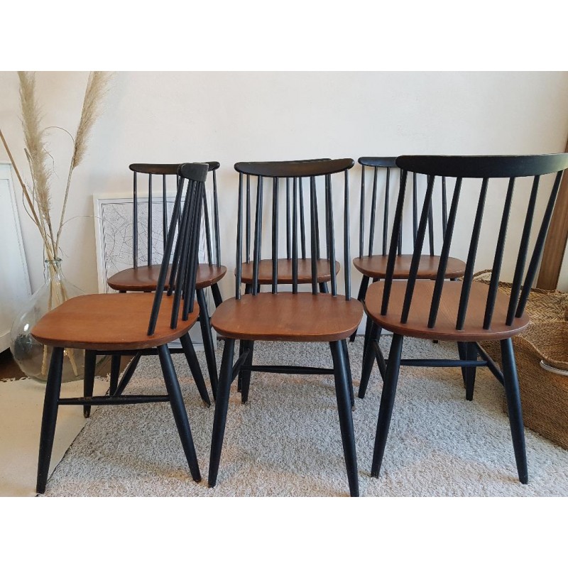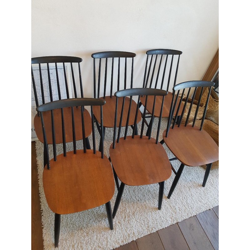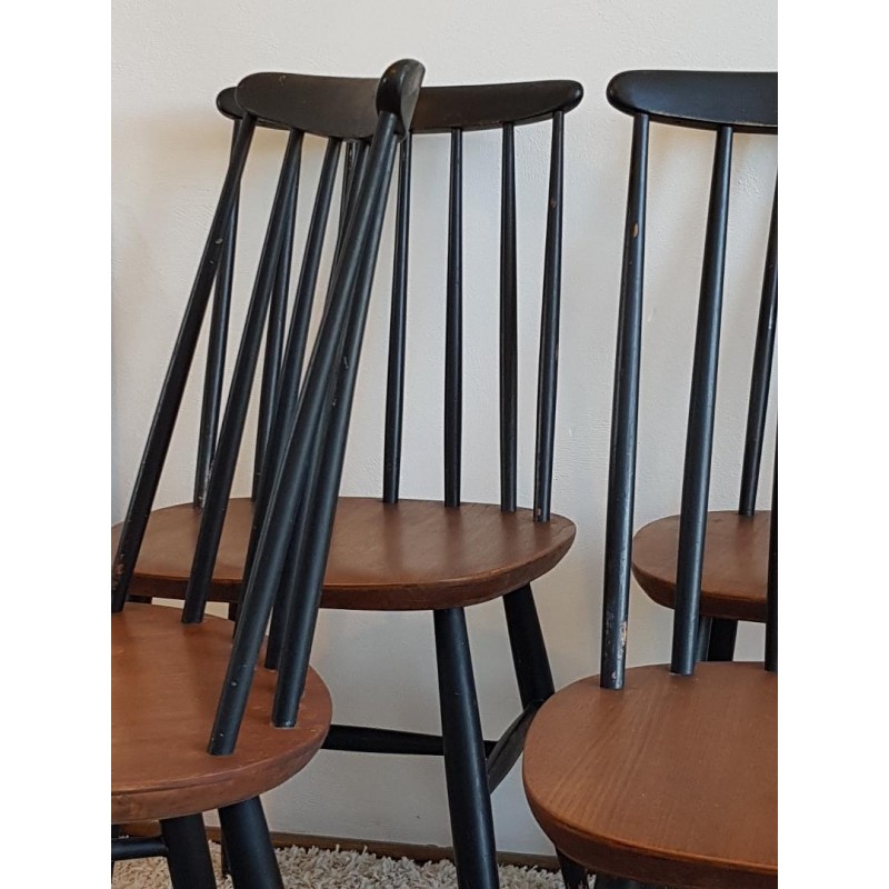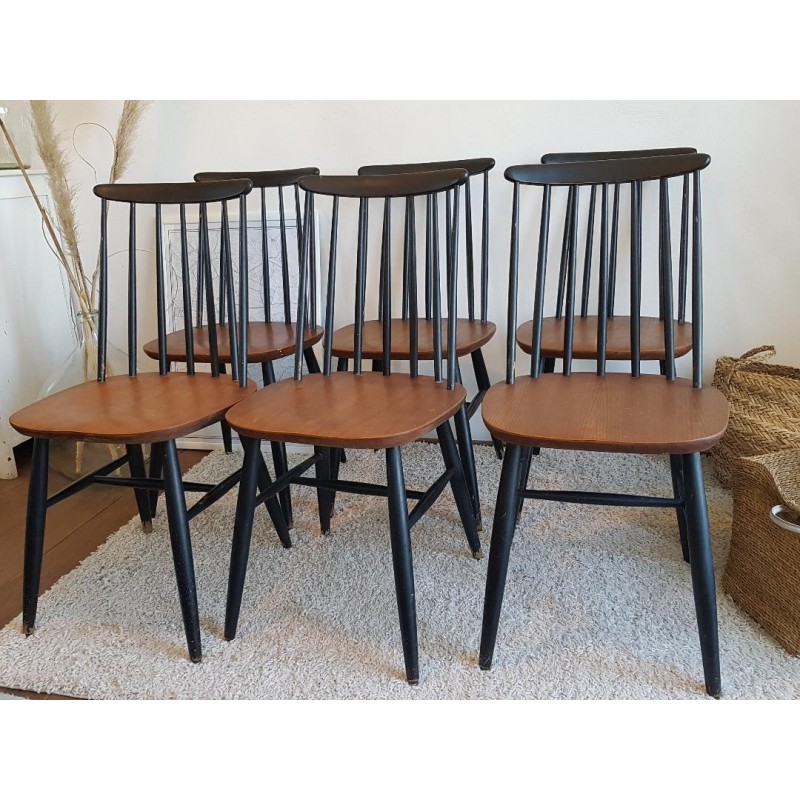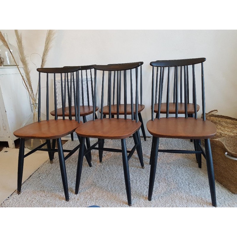 Suite de 6 chaises années 60 dans l'esprit du modèle Fannet de I.Tapiovaara. Stables. En bon état général . Quelques traces usuelles (cf photos) comme par exemple la peinture noire d'époque qui est "used" à certains endroits ce qui participe à la belle patine de l'ensemble.