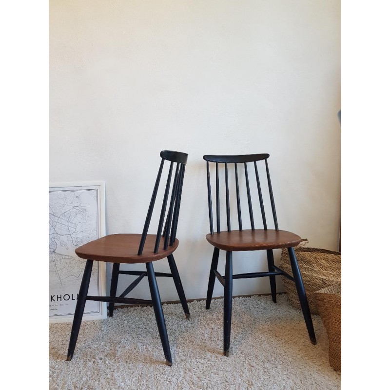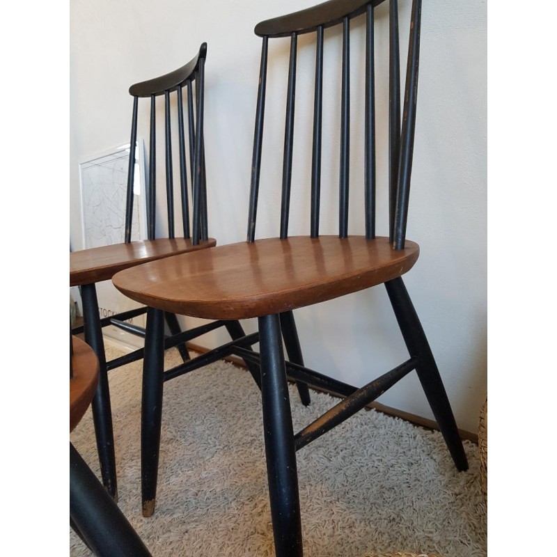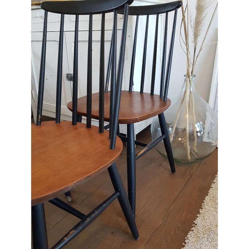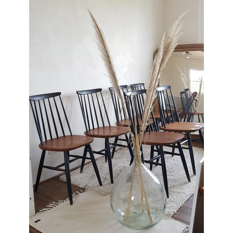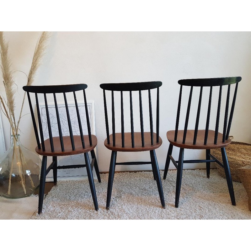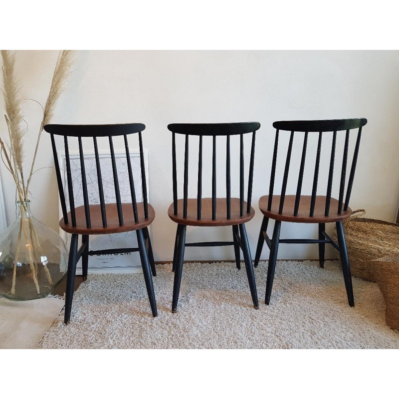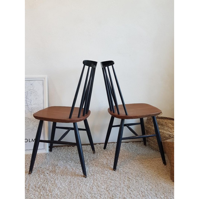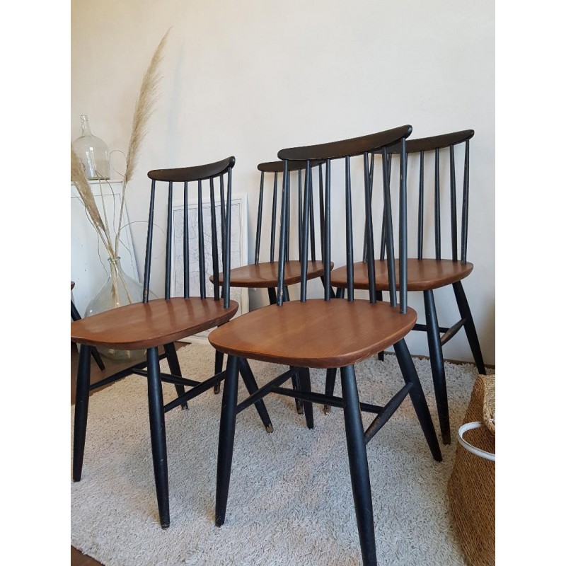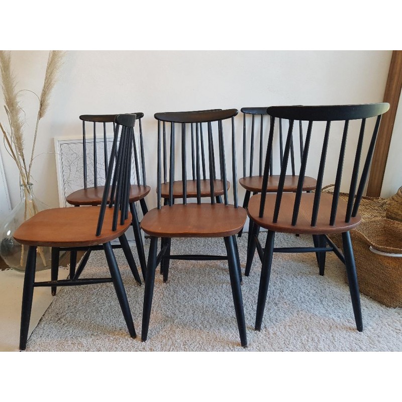 Suite de 6 chaises années 60 dans l'esprit du modèle Fannet de I.Tapiovaara. Stables. En bon état général . Quelques traces usuelles (cf photos) comme par exemple la peinture noire d'époque qui est "used" à certains endroits ce qui participe à la belle patine de l'ensemble.